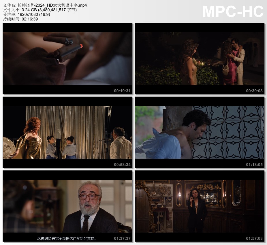 Partenope(意语拼法),她和她的城市同名,但她不属于海妖或神话人物。从1950年出生到现在,她漫长的一生体现了人类存在的全部色彩:青春的快乐和消逝,古典美的时过境迁,无意义和不可及的爱恋,平淡的调情和疯狂的激情,卡普里岛上的月夜之吻,幸福的瞬间和痛苦的延续,真实和虚构的父亲 ,结束和新的开始。还有许多其他人物:被注视和被爱着的男人和女人,他们的忧郁和沮丧,他们的焦躁和失望,他们对再也无法因一个优雅男士在街头跌倒而发笑的痛苦。所有这一切都伴随着时间而流逝,时间是她最忠实的伴侣。还有那不勒斯,她诱惑而迷人,她喧闹又大笑,她也知道如何伤害你。