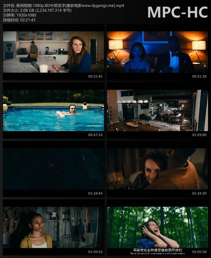 在这部由屡获殊荣的编剧兼导演山姆·艾斯梅尔(《黑客军团》)执导的末世惊悚片">惊悚片中,阿曼达(奥斯卡金像奖得主朱莉娅·罗伯茨饰)和她的丈夫克莱(荣获奥斯卡金像奖提名的伊桑·霍克饰)租了一套豪华住宅,与孩子阿奇(查利·埃文斯)和罗丝(法拉·麦肯齐饰)共度周末。他们的假期很快就被两个陌生人 — G.H.(奥斯卡金像奖得主马赫沙拉·阿里饰)和他的女儿露丝(米哈拉饰)— 的到来所颠覆,这两个人得知发生了神秘的网络攻击,并在声称属于他们的房子里寻求庇护。两个家庭都面临着一场迫在眉睫的灾难,这场灾难越来越可怕,迫使每个人都不得不努力在这个崩溃的世界中找到自己的位置。《断讯》改编自鲁曼·阿拉姆荣获国家图书奖提名的小说,由 Esmail Corp、Red Om Films 制作,Higher Ground Productions 负责监制。