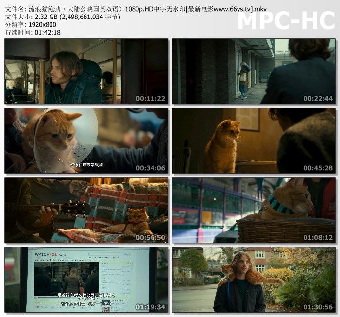 改编自詹姆斯-鲍文的同名小说,主人公是一个伦敦街头的流浪艺人,过着有一顿没一顿身染毒瘾的混沌日子,直到有一天他偶遇了姜黄色流浪猫鲍勃,一人一猫就这样改变了对方命运