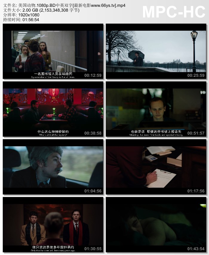 儿时玩伴斯潘塞和沃伦很反叛,他们和其他两个学生谋划到特兰西瓦尼亚大学的特别收藏图书馆,去偷极其珍贵的奥杜邦版画和珍藏书。这部电影是根据真实故事改编,源于2004年发生在美国肯塔基州列克星敦市的特兰西瓦尼亚大学的一次图书馆抢劫事件。这个故事看起来非常离奇,但大部分情节都是真实发生的,四个年轻人为了一部电影毁了一生,实施了美国历史上最鲁莽的抢劫之一。《美国动物》将抢劫类电影发挥到极致,在金钱、电影、追寻意义的疯狂故事中模糊现实与想象的界限。