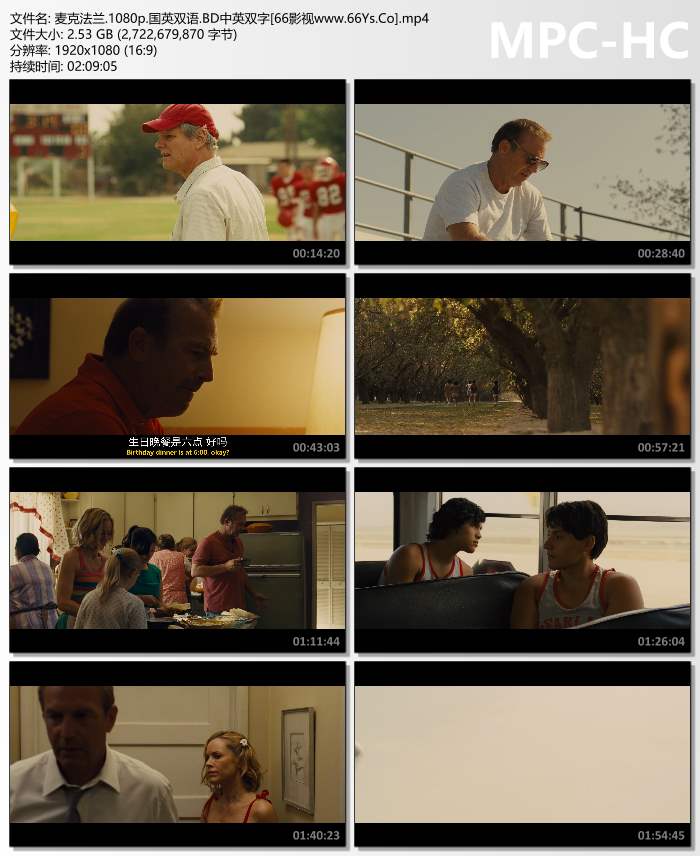 《麦克法兰》根据1987年的真实故事改编,科斯特纳扮演的教练来到一个穷困无比,尘土飞扬,居民多为拉美裔的农业小镇,将那里的高中生们变成越野赛跑健将,给自己,也给小镇带来希望。