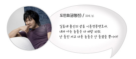 曾经梦想着当保护社会上弱者们的权益的正义律师,因此开始了司法考试,但以优异的成绩合格并毕业司法研修院之后,艰难地当上离婚专业律师。每天为办公室租赁费等现实问题头疼,早已抛开了曾经的梦想。